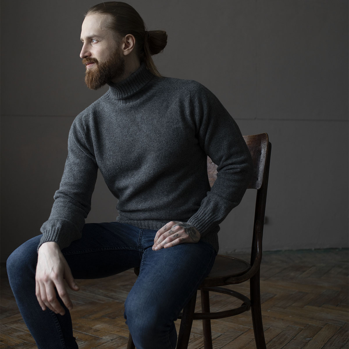Quite thin yet warm lightweight roll neck seamless sweater in dark grey color. Knitted by Harley of Scotland with fine soft lambswool.
