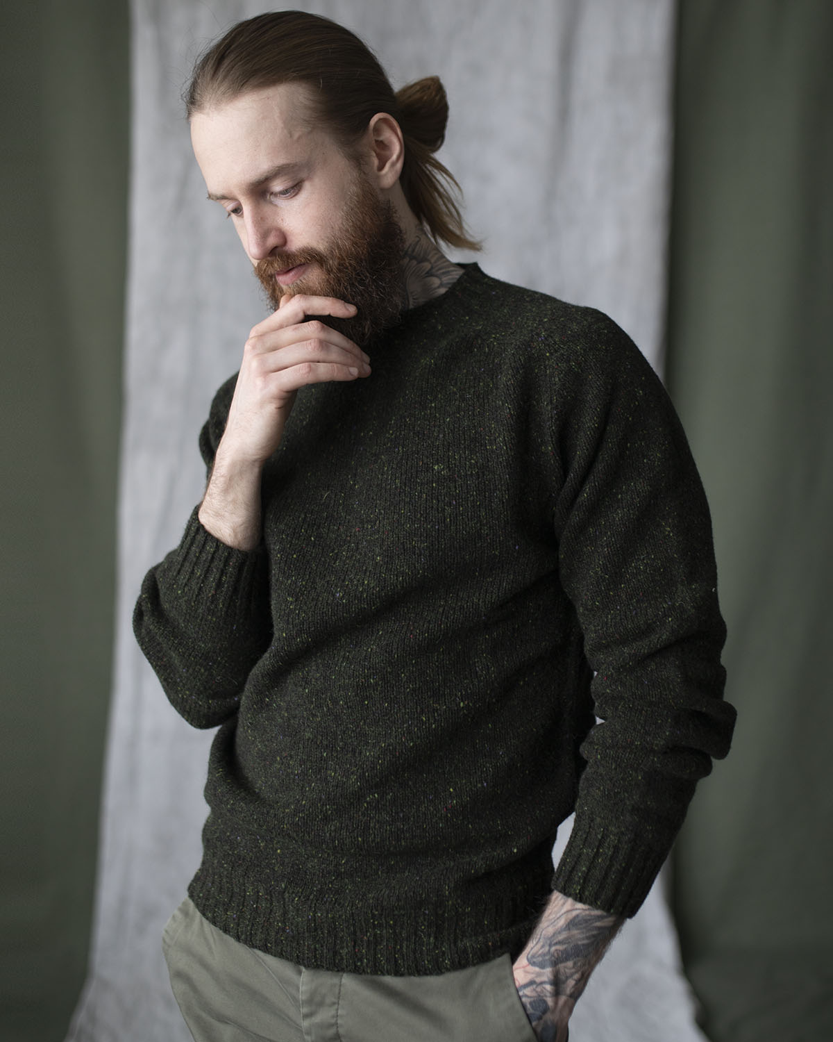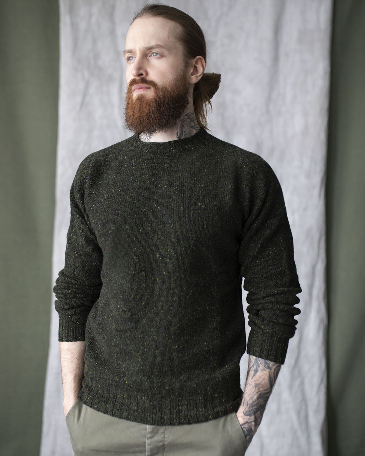 Crew neck jumper made of natural wool by Harley of Scotland. Melange yarn in dark green color with some colorful flecks.