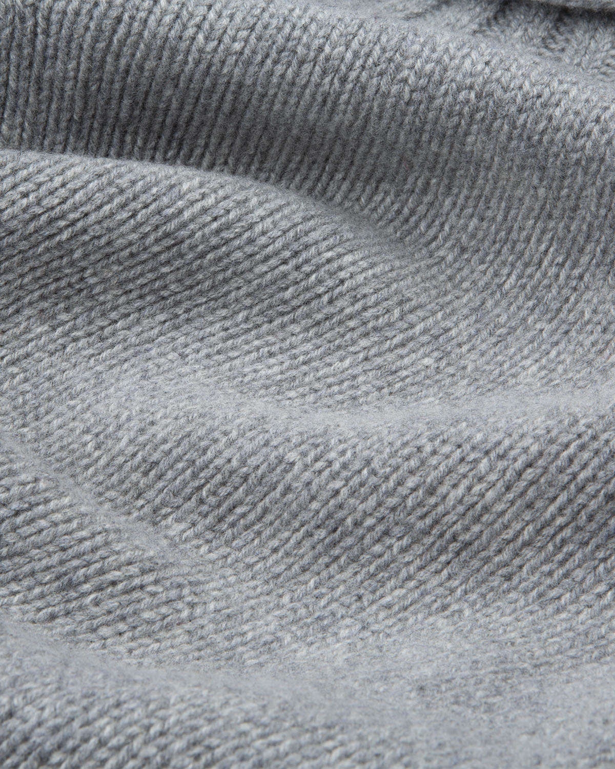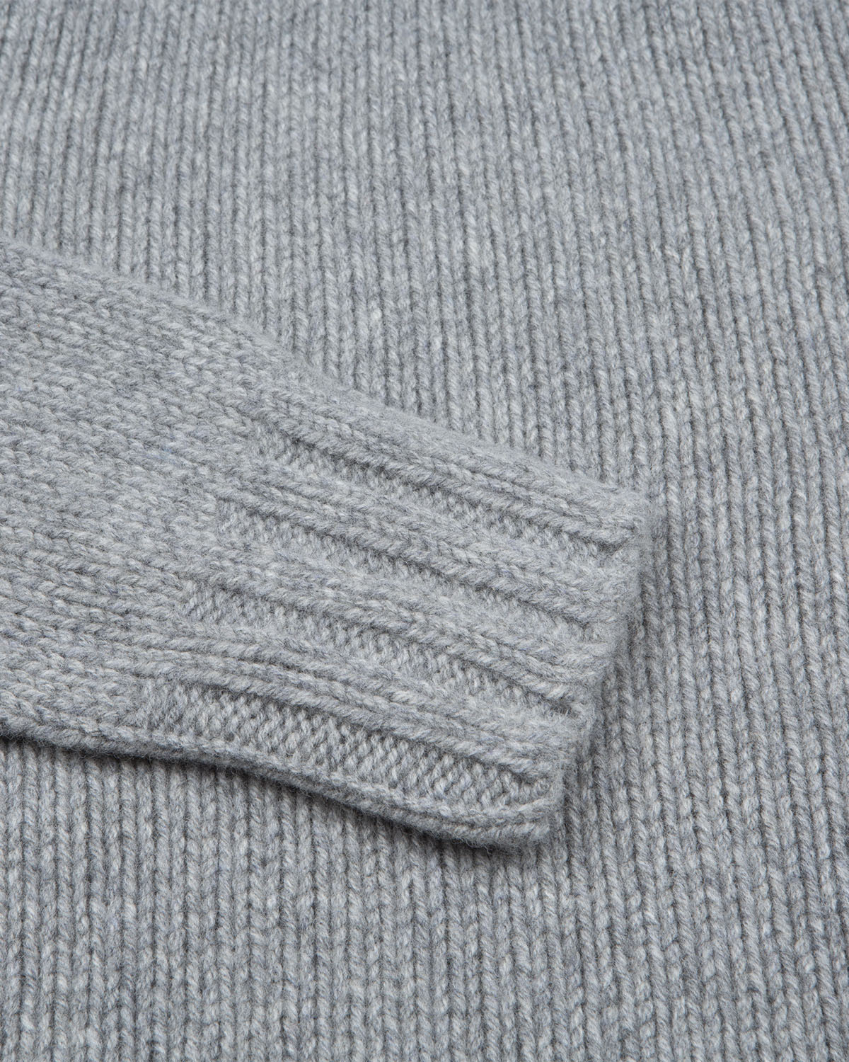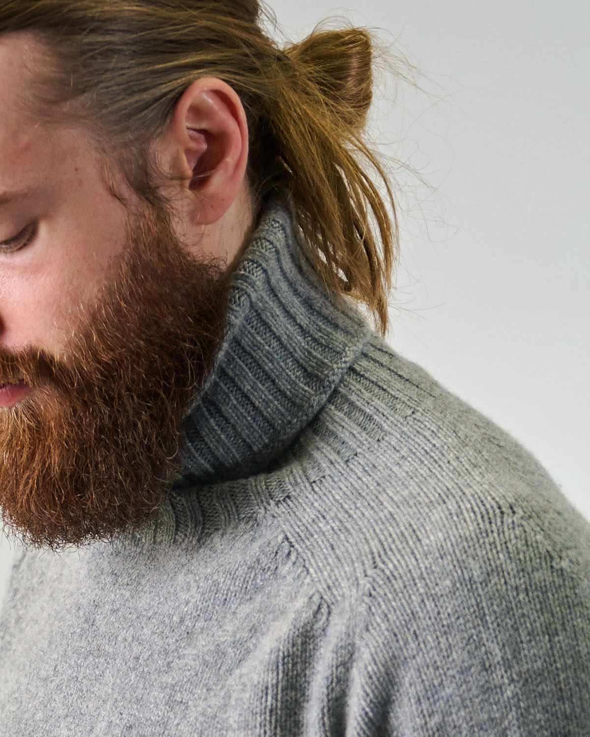 Medium-weigh gents roll neck sweater in flannel grey color. Very warm and soft thanks to luxurious lambswool spunned into a fine yarn at one of the oldest Scottish woollen mills. Knitted in Scotland using seamless technology by Harley of Scotland - family business producing quality knitwear since 1929.