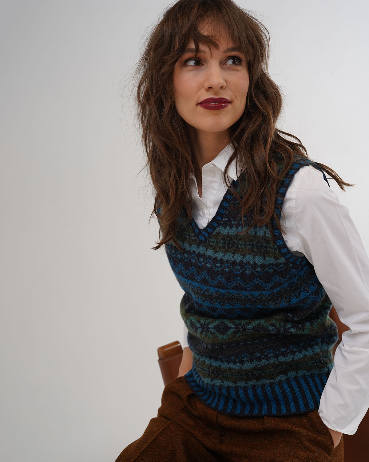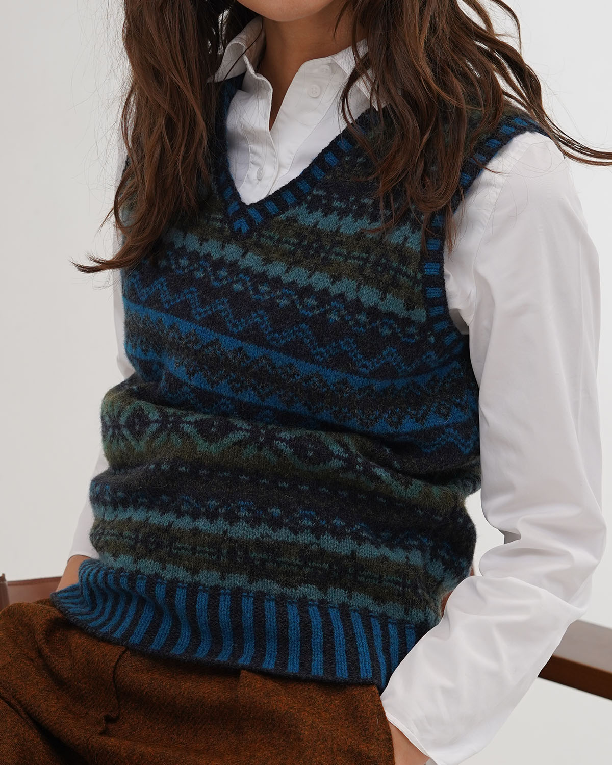 Eye-catching v-neck slipover vest in decent mix of navy, blue, teal and green colors. Knitted in Scotland in jacquard technic using lightweight and durable shetland wool. Suitable both for women and men.