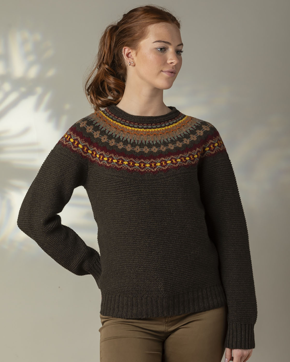 Fresh looking loose fit ladies sweater in deep dark green colour with dark red, orange, yellow and teal. The main part of the sweater is knitted with reverse stockinette stitch that gives a textured look to the garment. Made from soft merino lambswool.