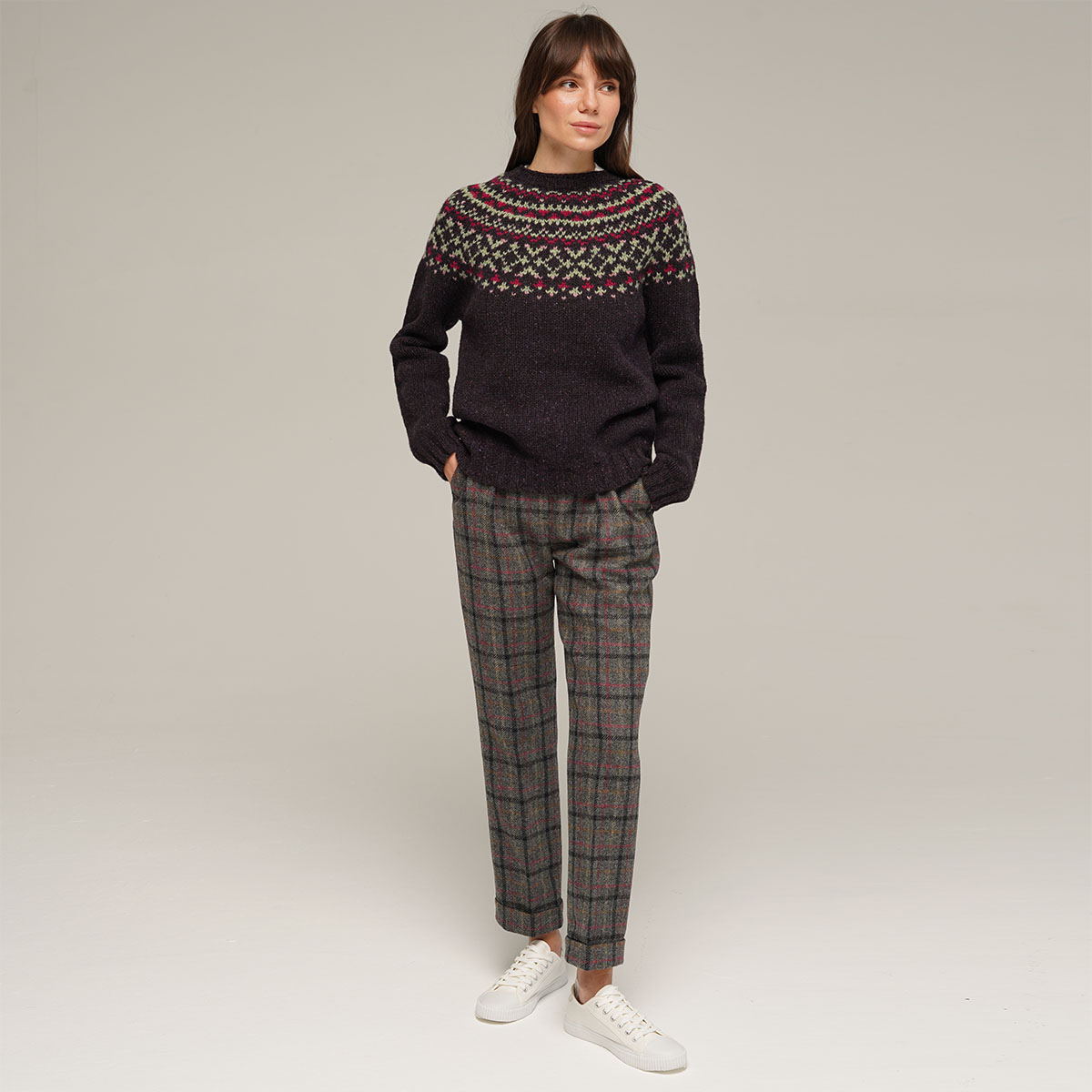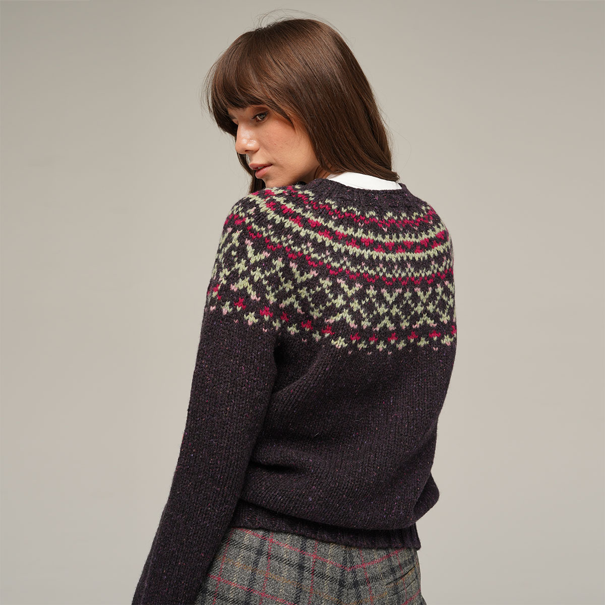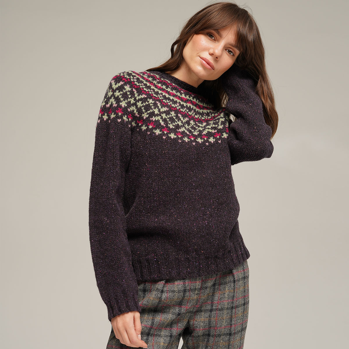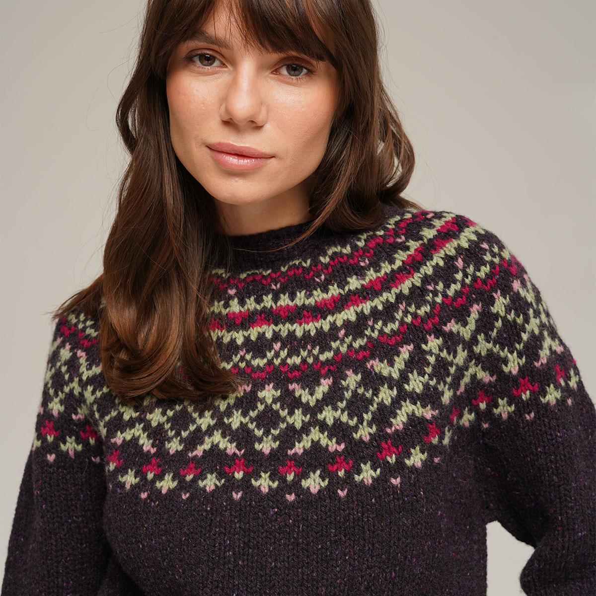 Relaxed fit seamless ladies sweater - a modern interpretation of a classic fair isle knitwear. Crafted from midweight soft yarn of marvelous dark purple colour with flashes of violet, red and pink and an ornament that goes all the way round the top of the chest and the back. Crafted from natural sheep wool at Harley of Scotland factory in Peterhead.