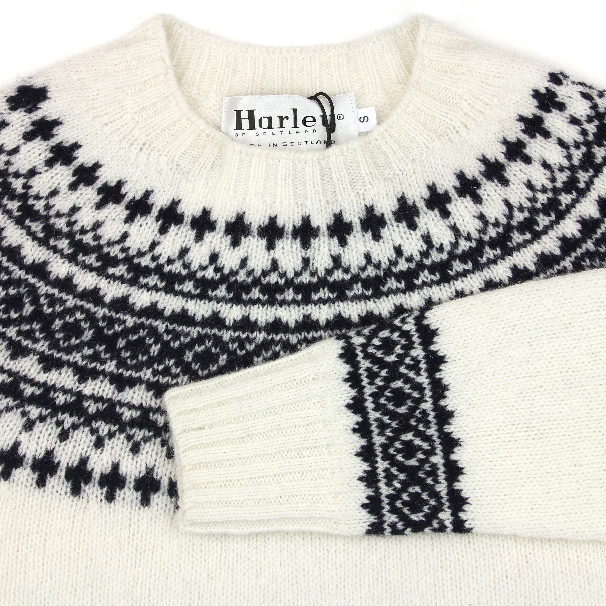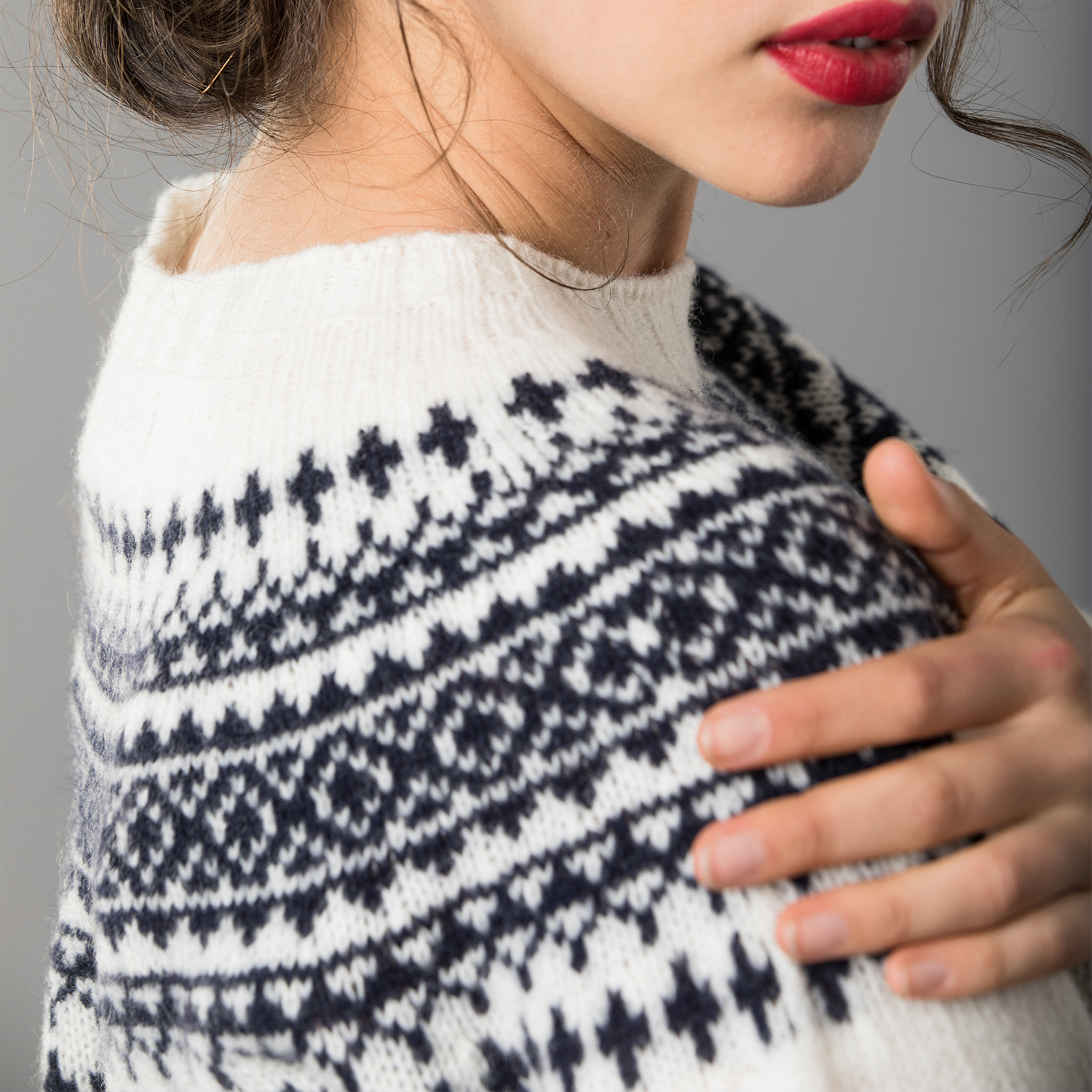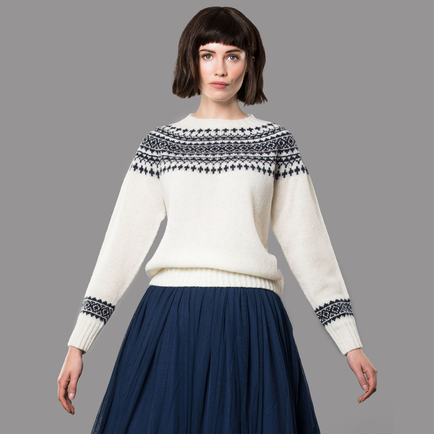 Scottish knitwear at its best: lightweight seamless jumper in pure white color with a neat navy fair isle ornament. Crafted in Scotland using local yarn made from pure wool of native shetland sheep.