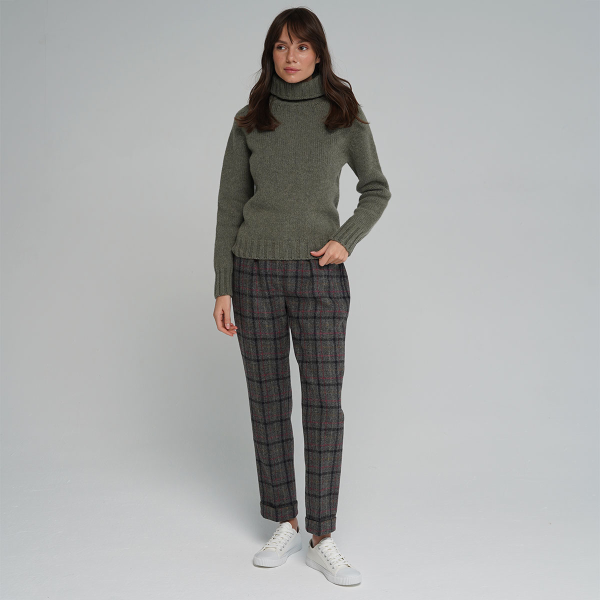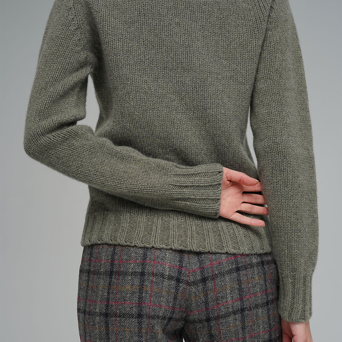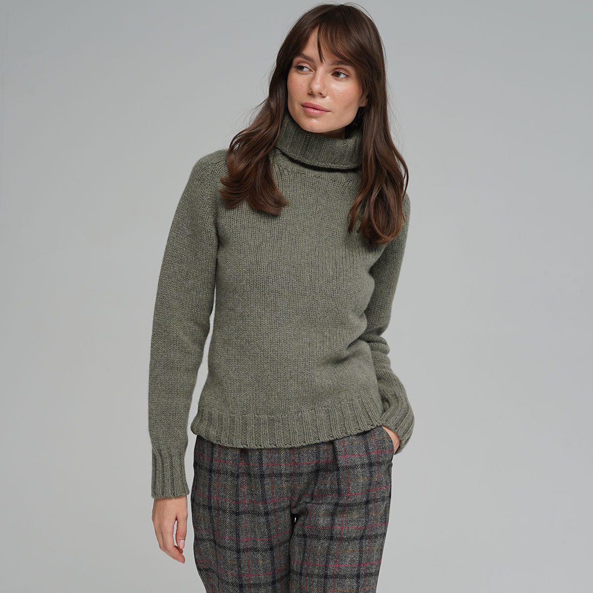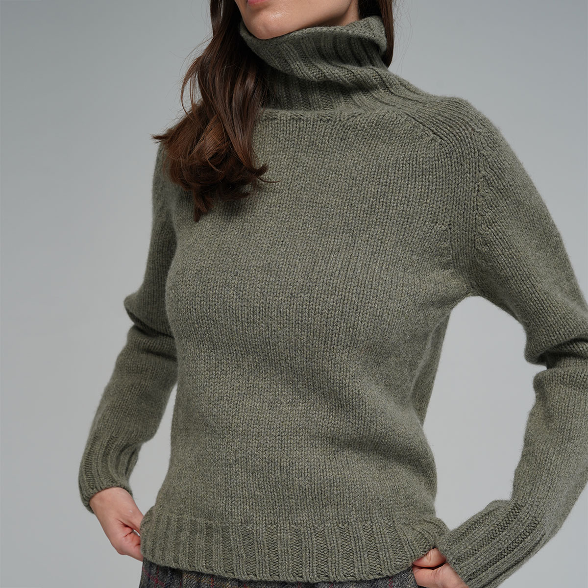 Medium-weight warm and comfortable ladies roll neck seamless sweater in moss colour. It is made using soft lambswool yarn spinned at one of the oldest mills in Scotland and knitted by Harley of Scotland.