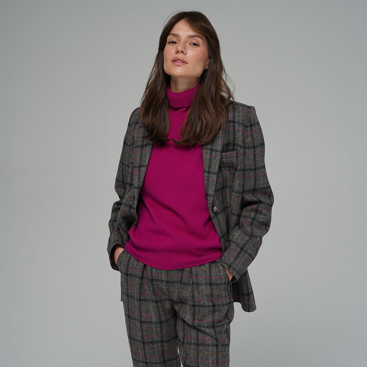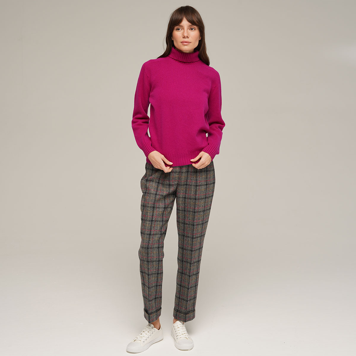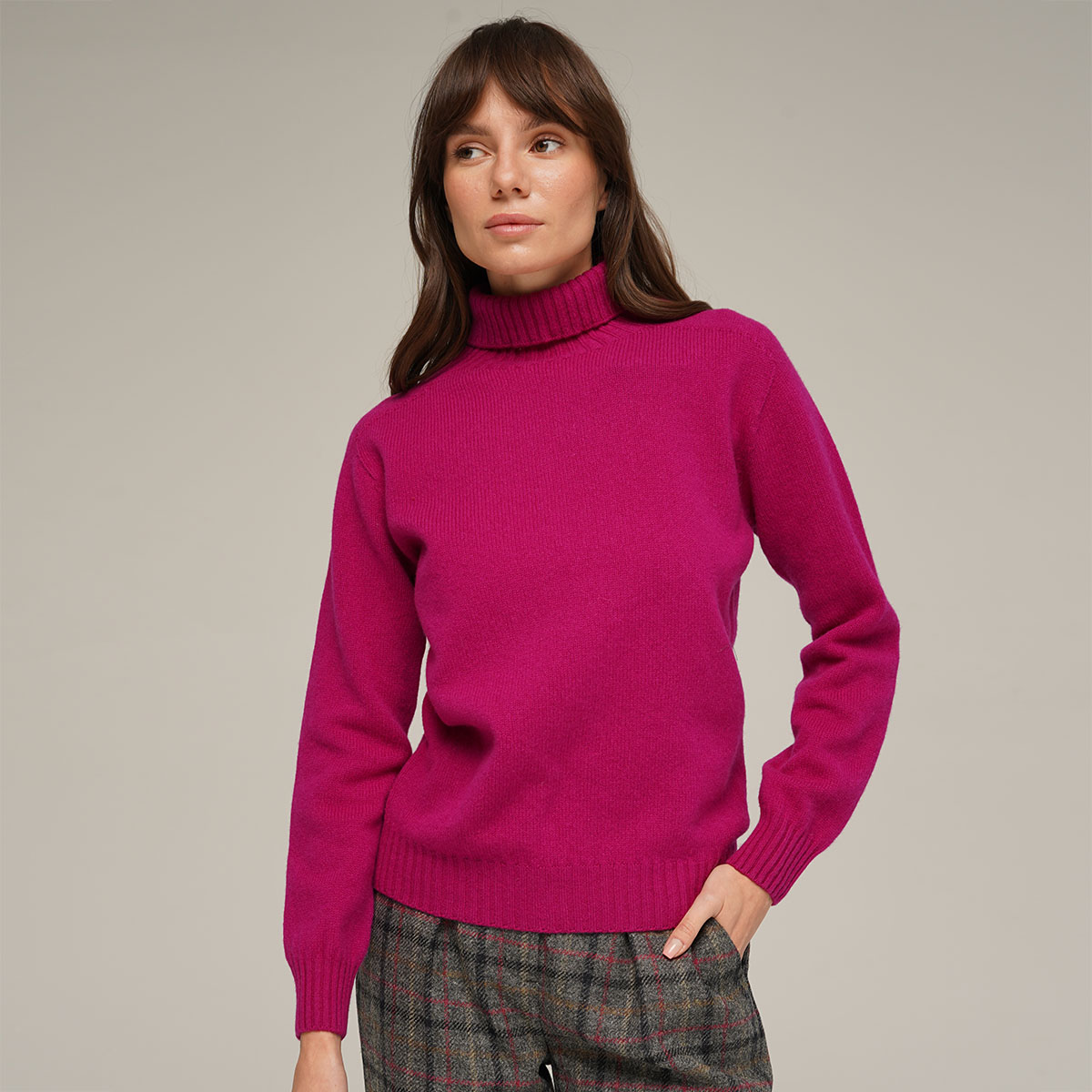 Lightweight yet warm roll neck seamless sweater in fuchsia color. Knitted by Harley of Scotland using soft lambswool yarn spinned at one of the oldest scottish mills. This sweater has a sleek texture and soft handle.