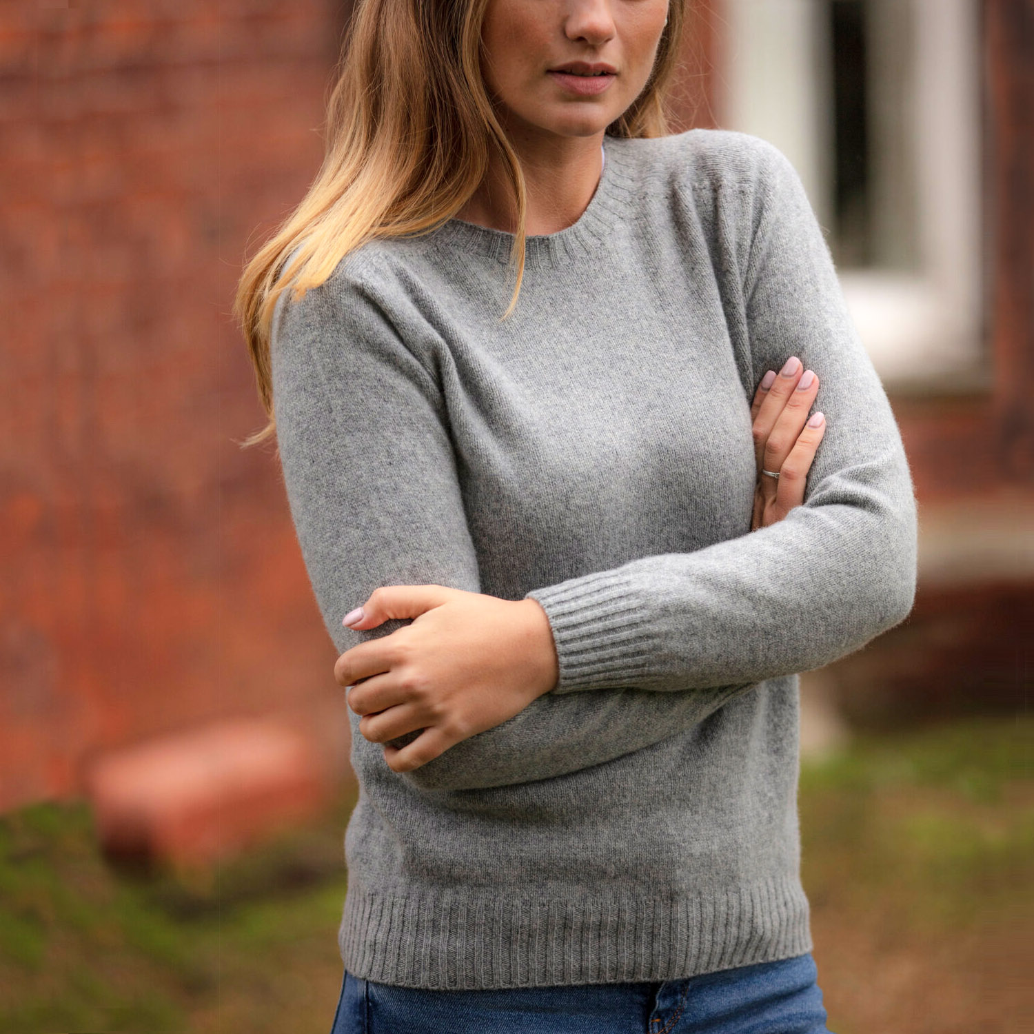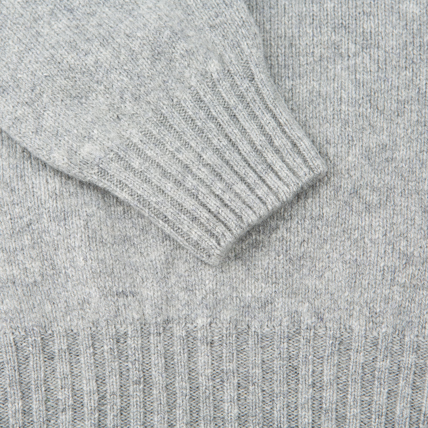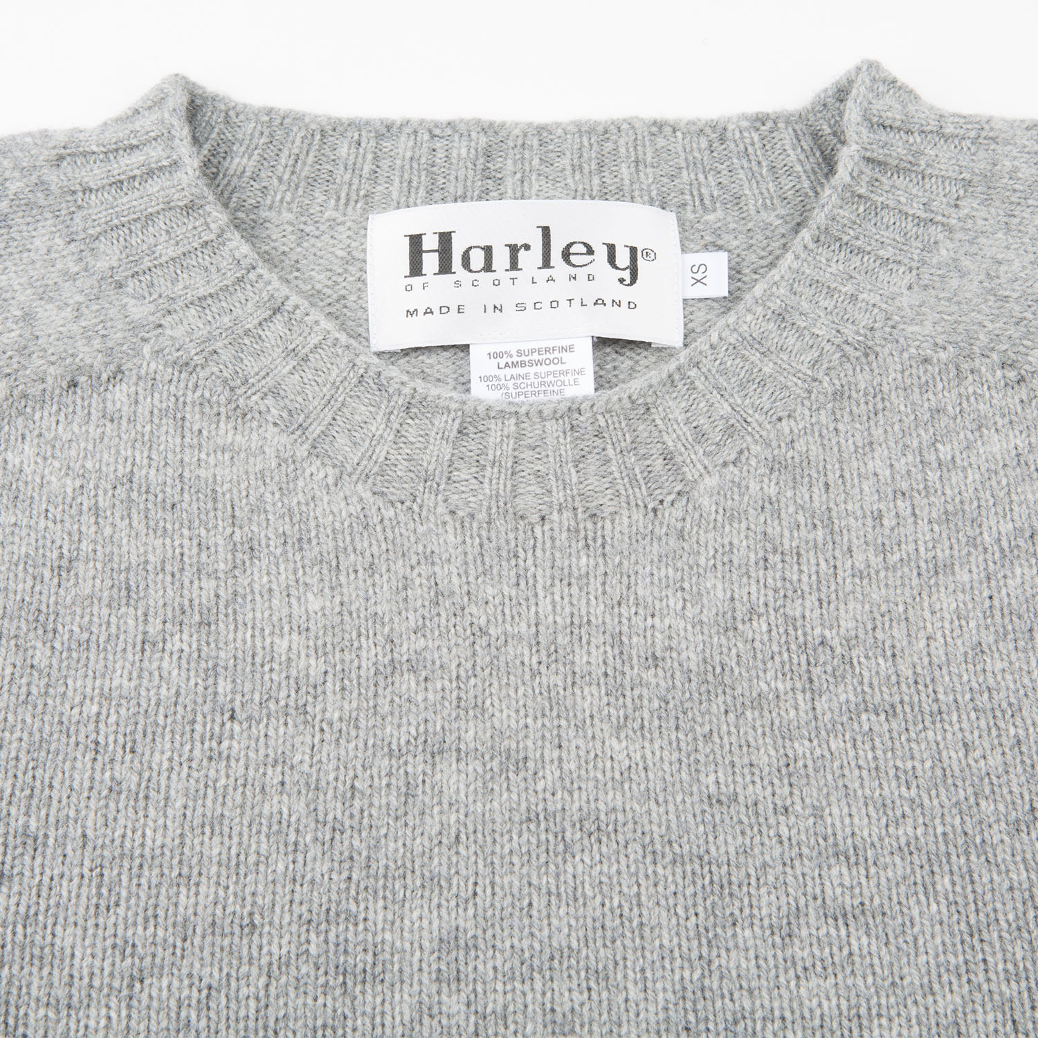 Lightweight yet warm crew neck seamless sweater in flannel grey color. Made from very soft lambswool yarn spinned at one of the oldest mills in Scotland. Knitted by knitwear specialists Harley of Scotland.